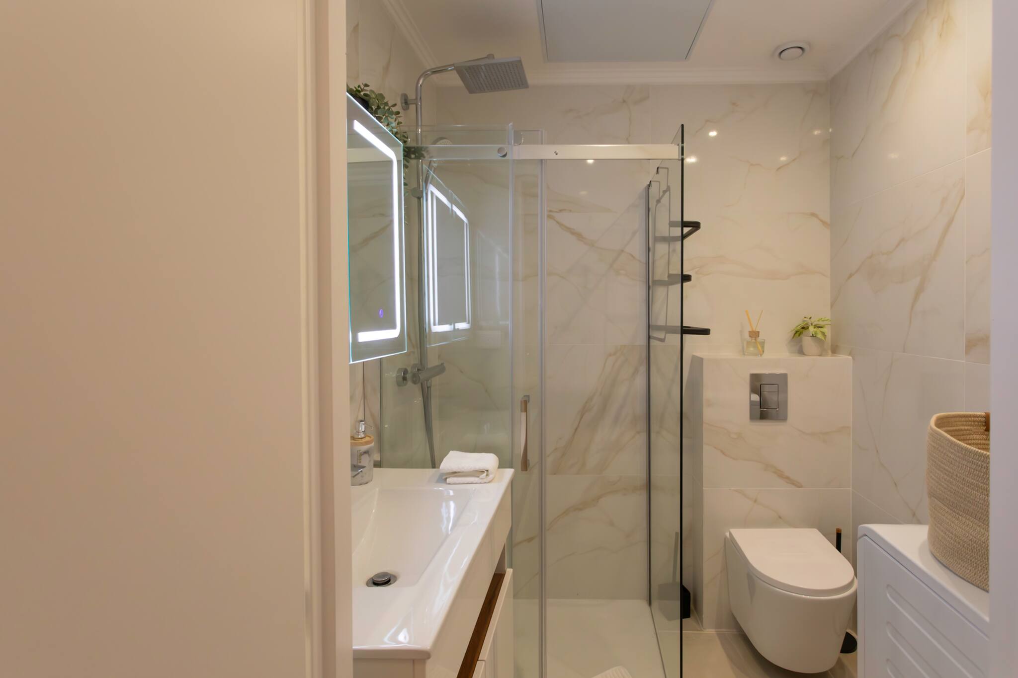 🚿 Salle de bain : douche, lavabo, sèche-cheveux, sèche-serviettes, WC et lave-linge.