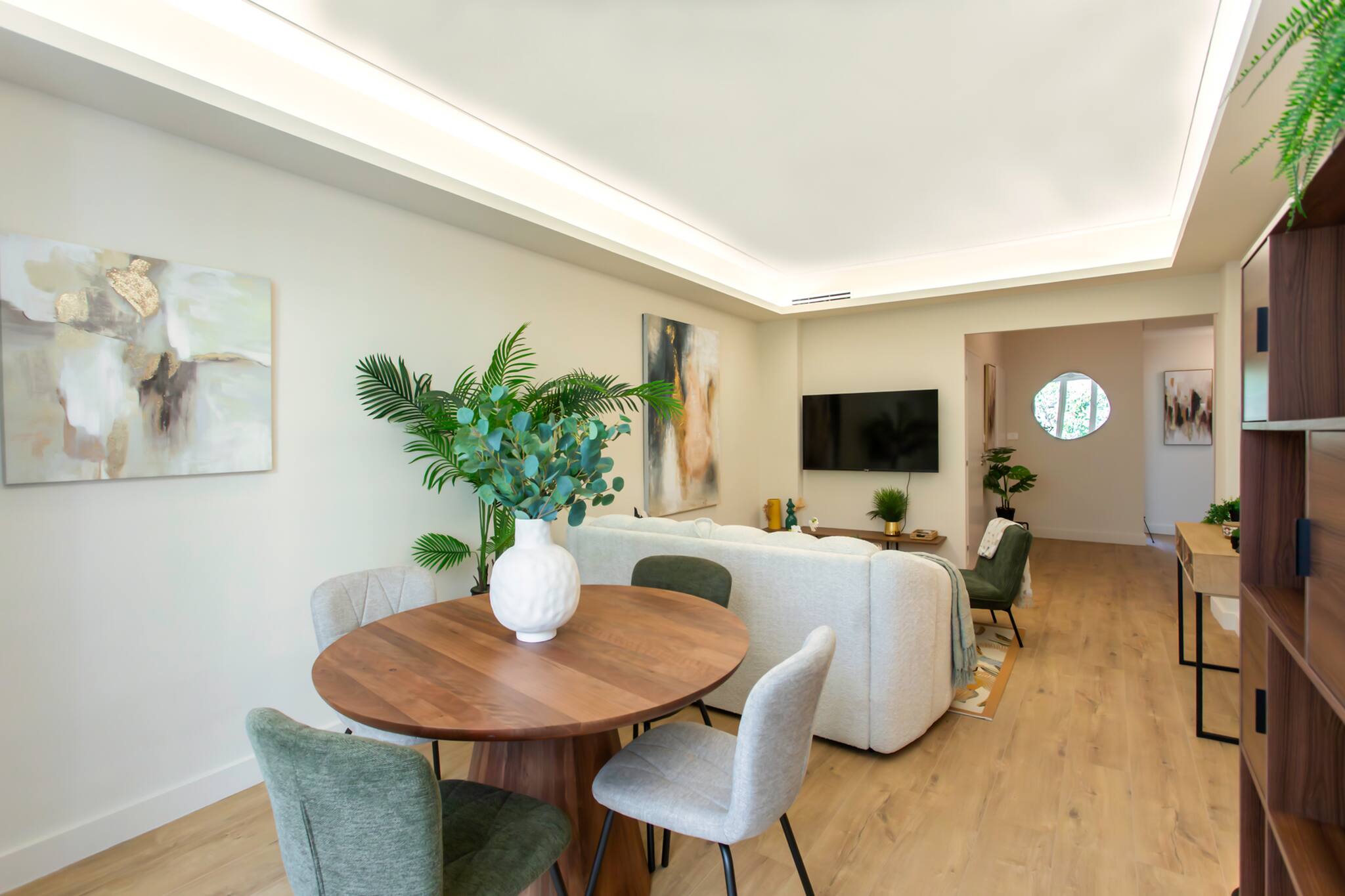 🍴 Coin repas convivial pour 4 personnes avec table ronde et chaises.