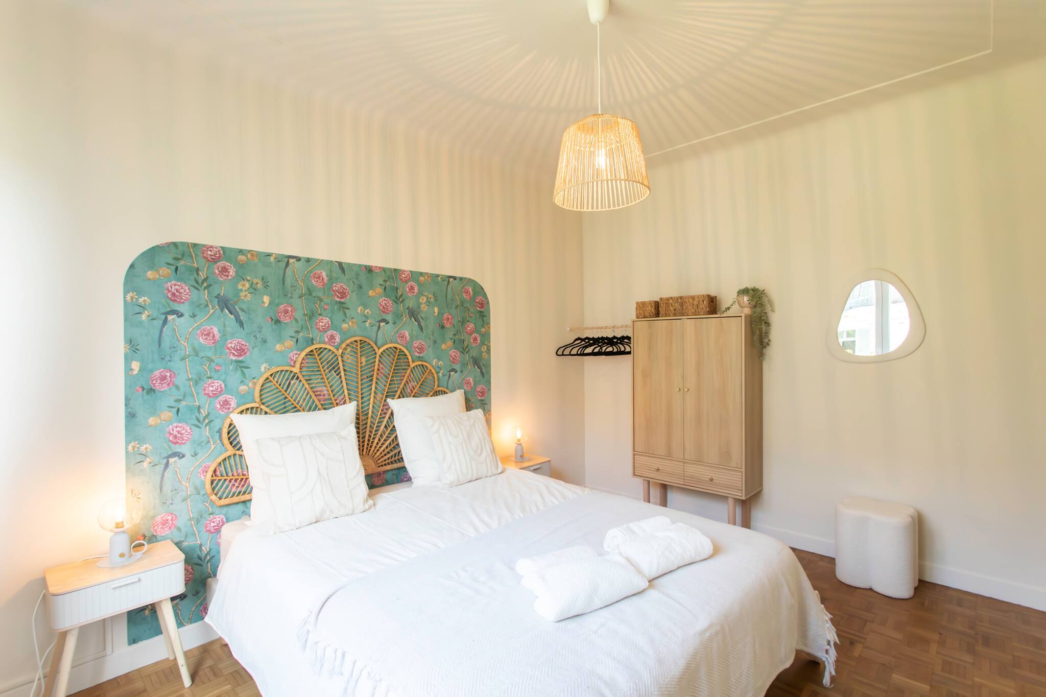 🛏️ Chambre 1 : lit Queen Size (160 cm), deux tables de chevet avec lampes, espace de rangement.
