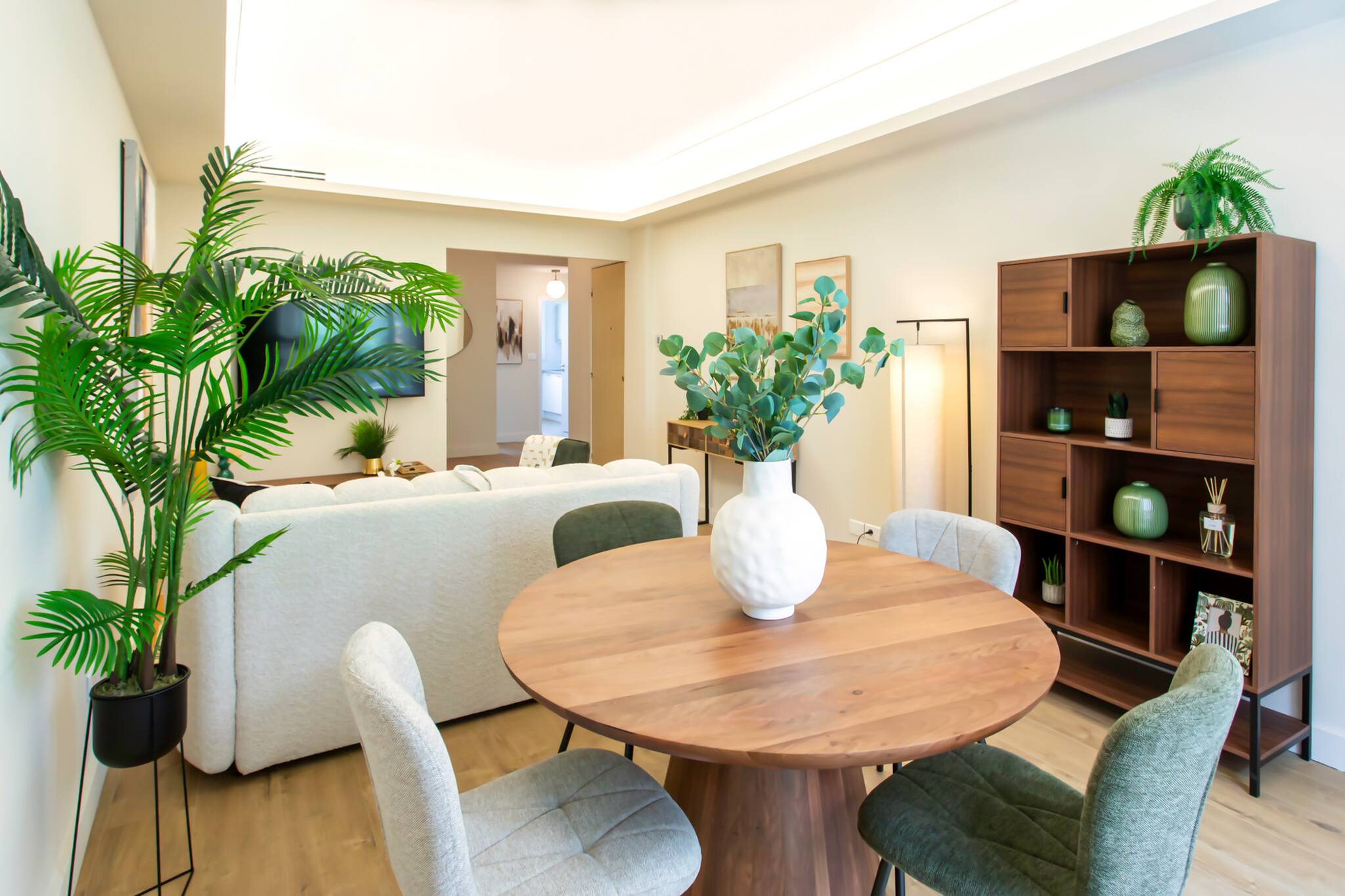 🛋️ Salon cosy : canapé, fauteuil, table basse, meuble TV, télévision et lampe sur pied.