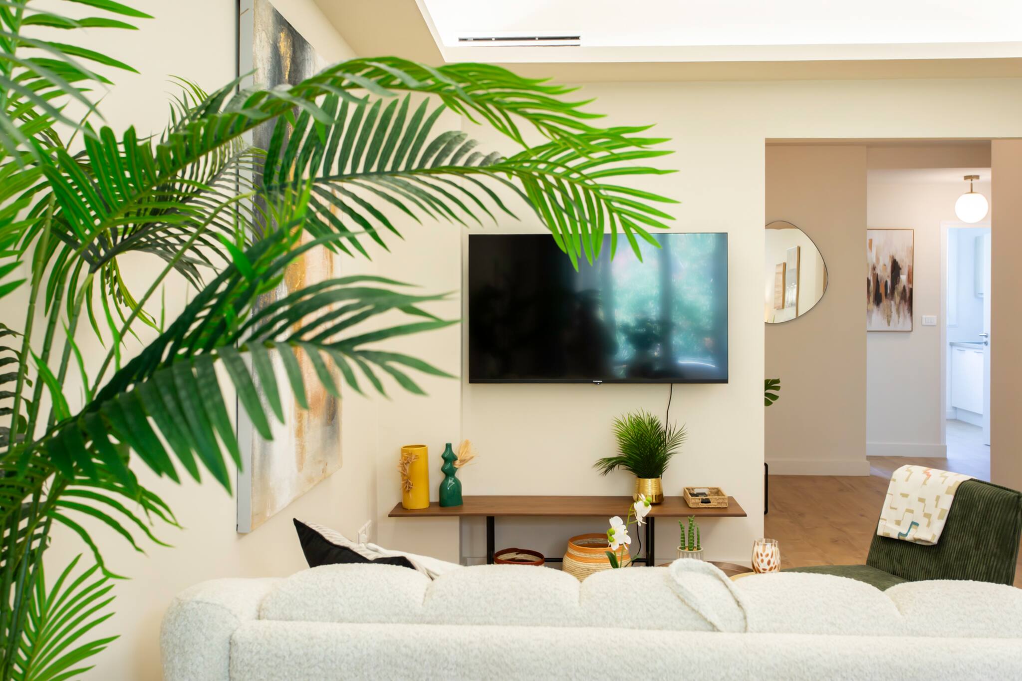 . Un salon avec canapé trois places, TV, une table basse et climatisation réversible