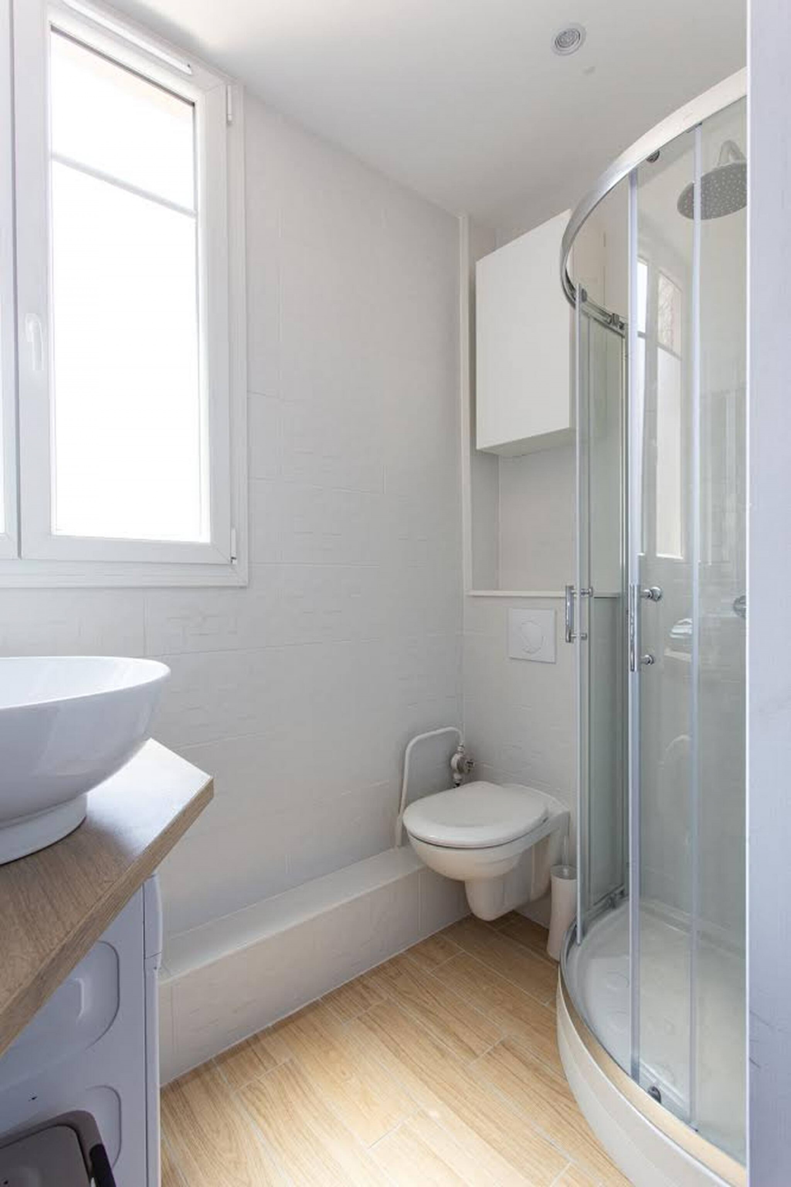 • Une salle de bains avec douche, sèche-cheveux et WC