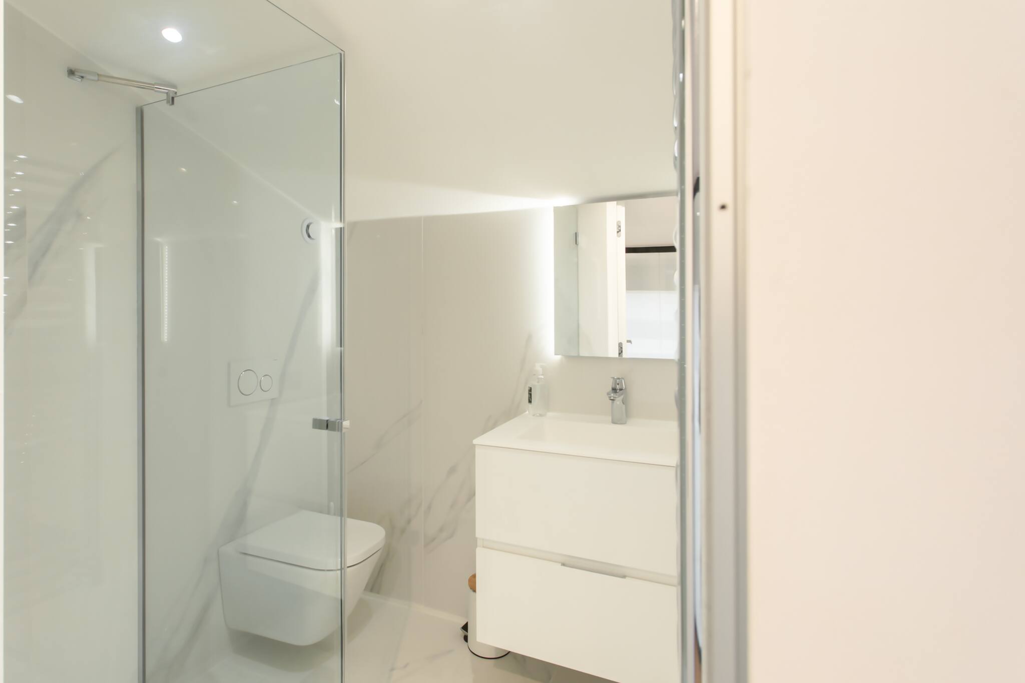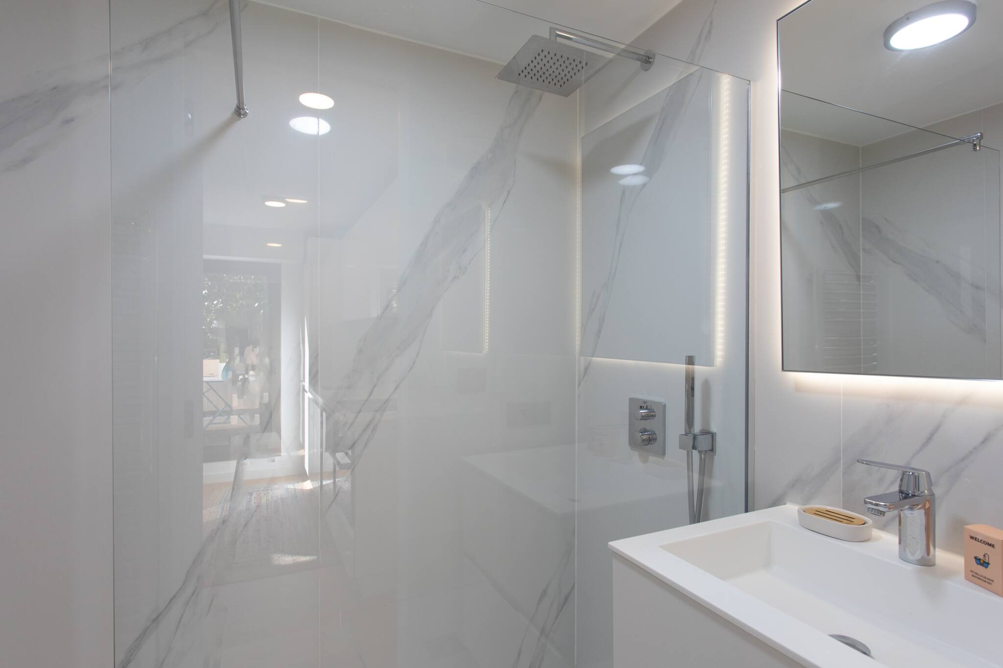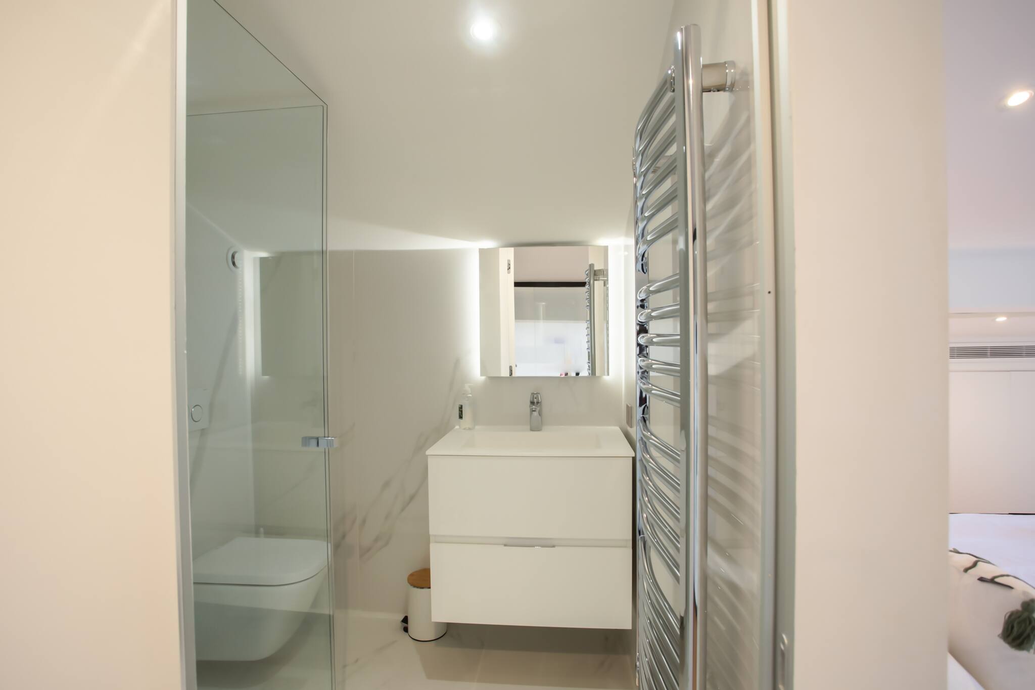 . Une salle de douche équipée d’une cabine de douche, d’une vasque, d’un sèche-cheveux, sèche serviette, miroir, rangement