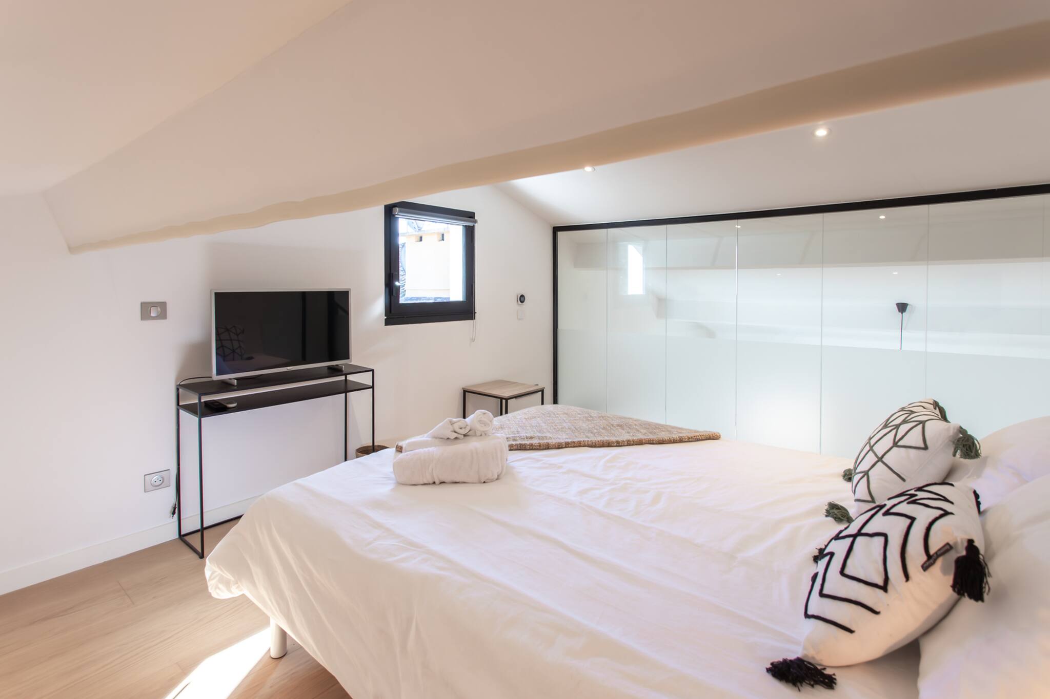 . Une deuxième chambre située au 1er étage équipée d’un lit double 160cm, de tables de chevets, lampes de chevets, d’une Tv avec table, placard de rangement, fenêtre de toit