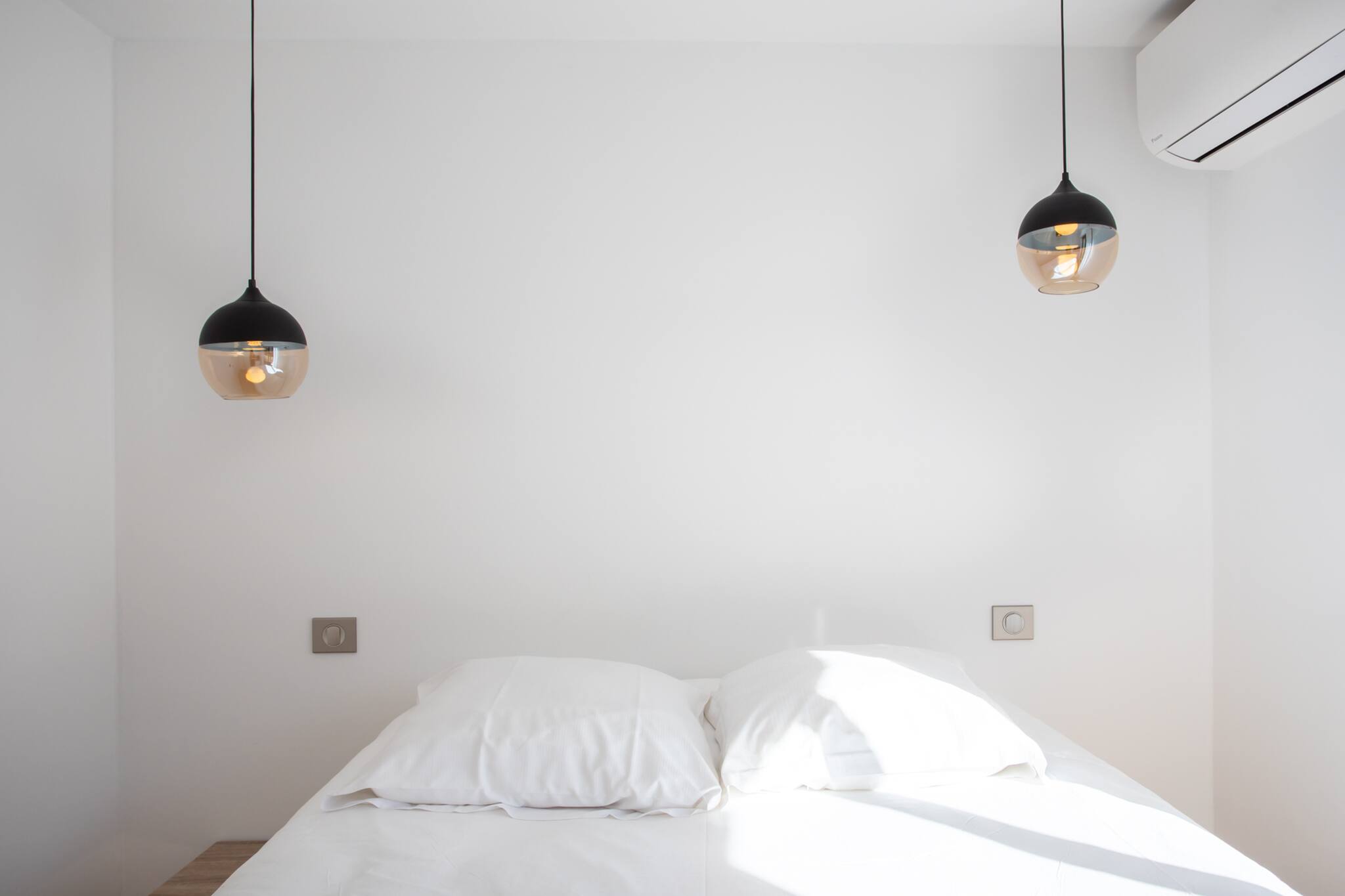 . Une première chambre lit double 160 avec climatisation, lampe de chevet, table de nuit et espace de rangement