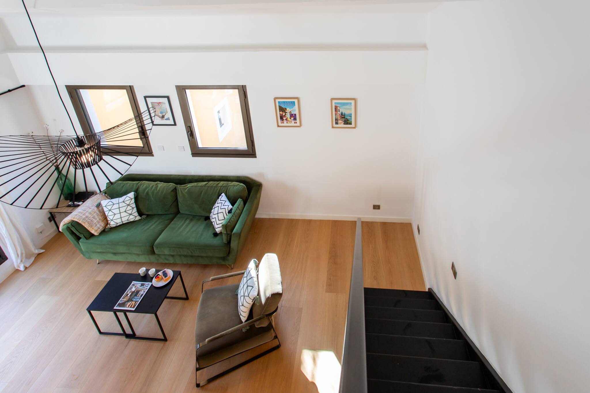 . Un grand espace salon équipé d’un canapé d’un fauteuil, table basse,