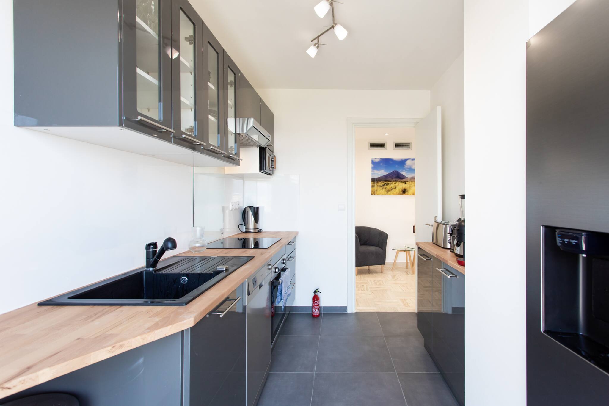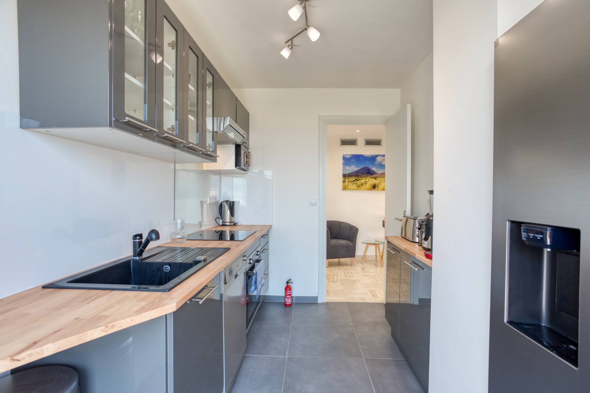 lave-vaisselle, cafetière Nespresso, bouilloire électrique, grille-pain, évier, plan de