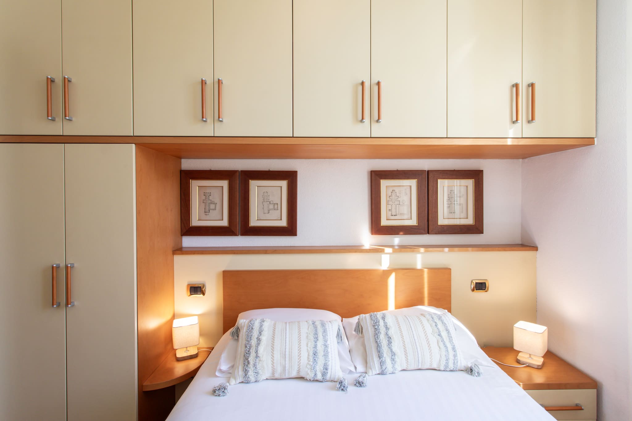 . Une chambre avec lit simple 90cm, équipée de climatisation, placards, bibliothèque, bureau et fenêtre double vitre avec vue sur la cour arborée et la Mer
