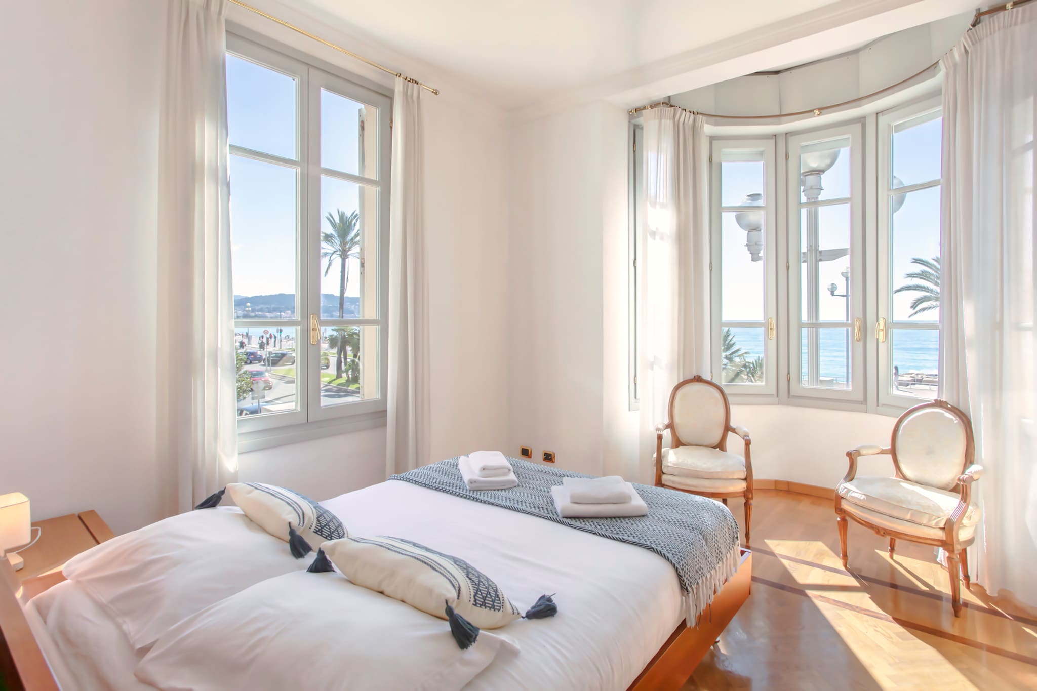 . La deuxième suite parentale est dotée d’une magnifique vue Mer et Promenade des Anglais, équipée avec lit double 140cm, climatisation réversible, tables de nuits et lampes de chevets, chaises, placards de rangements