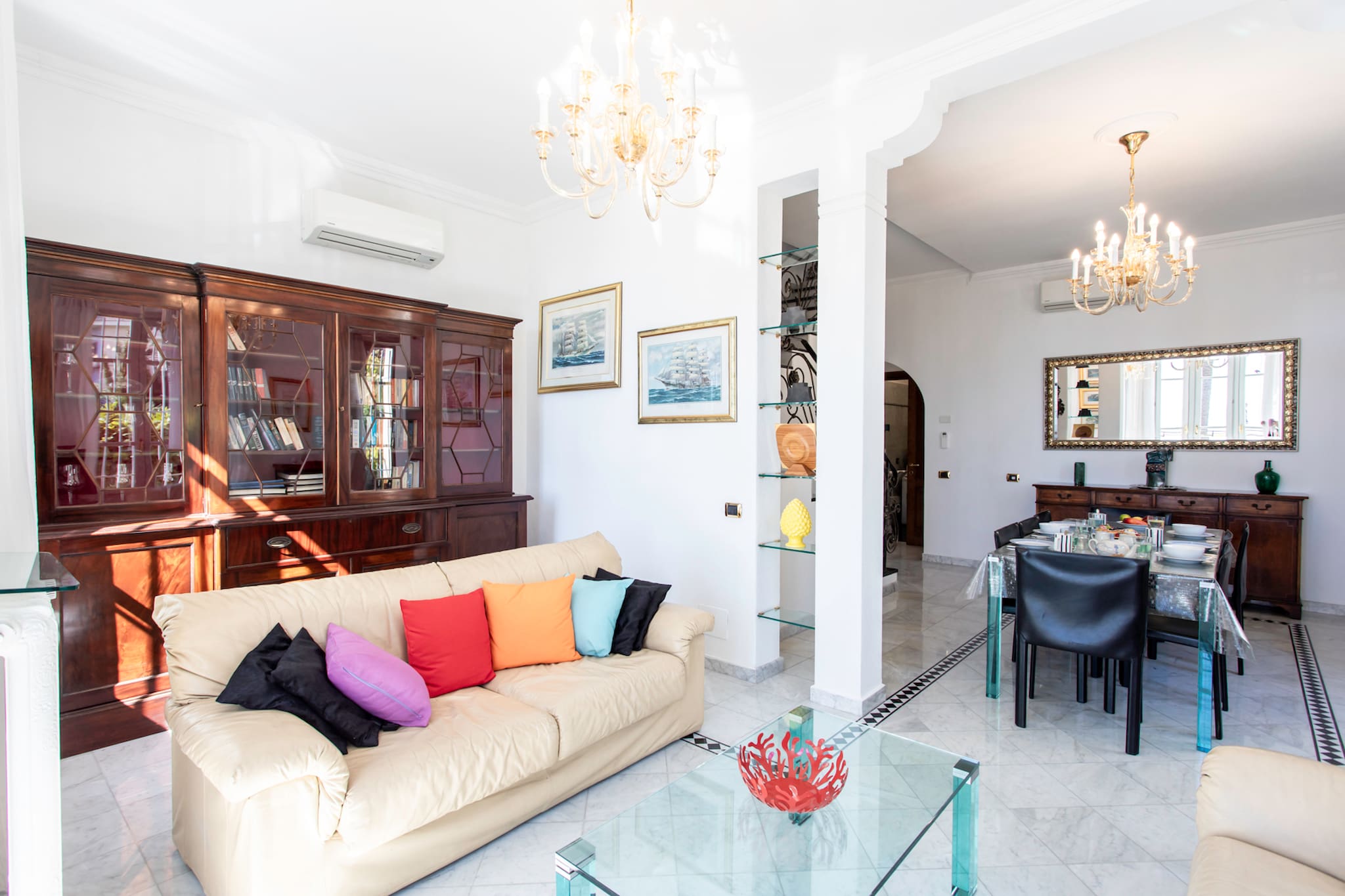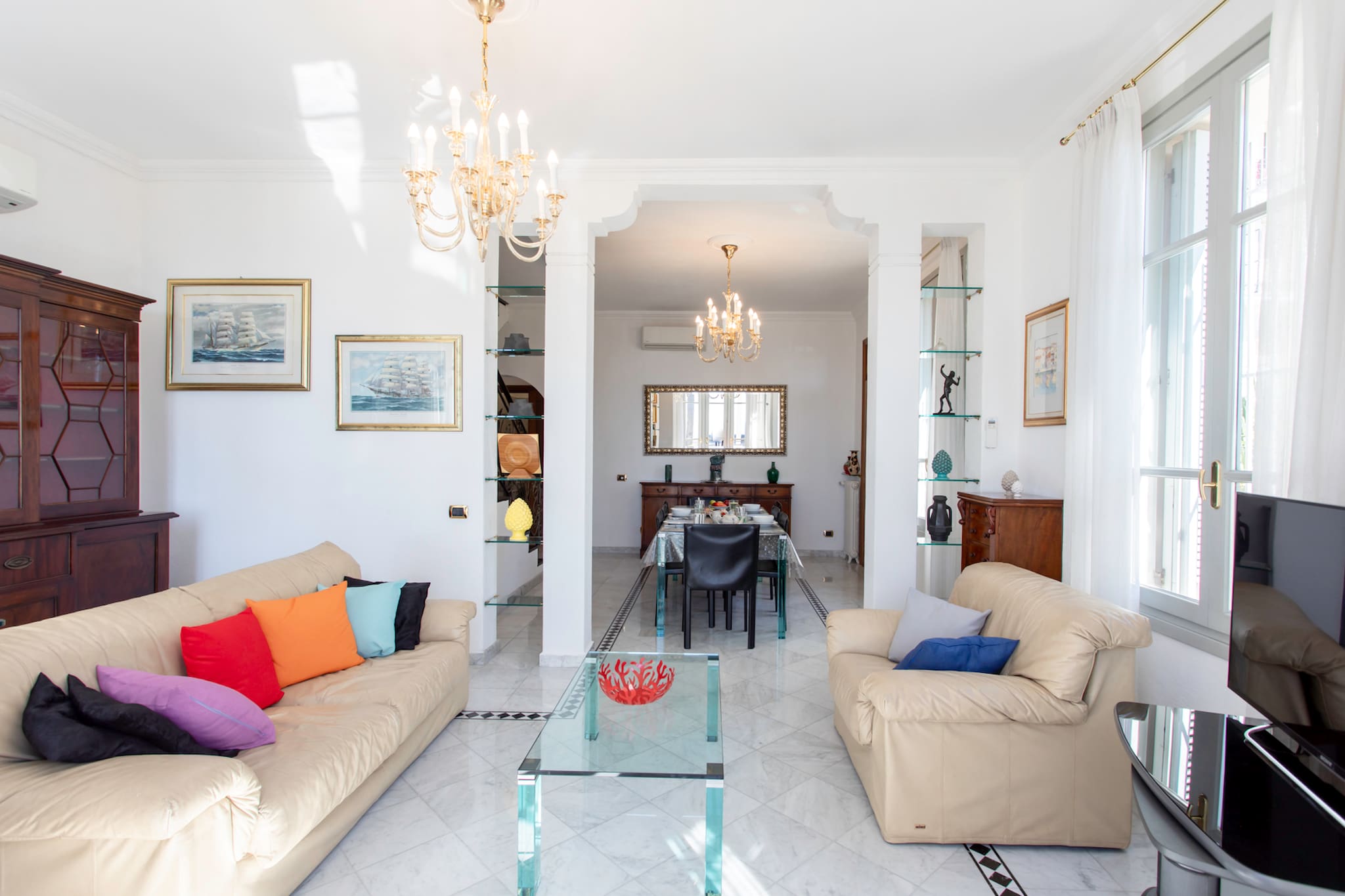 . L’espace salon donnant sur le balcon de la villa se compose de deux canapés, tables basses, TV et meuble TV, plafonnier
