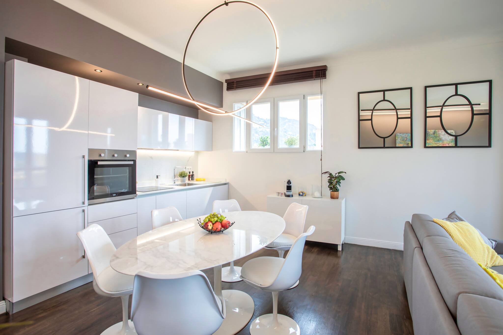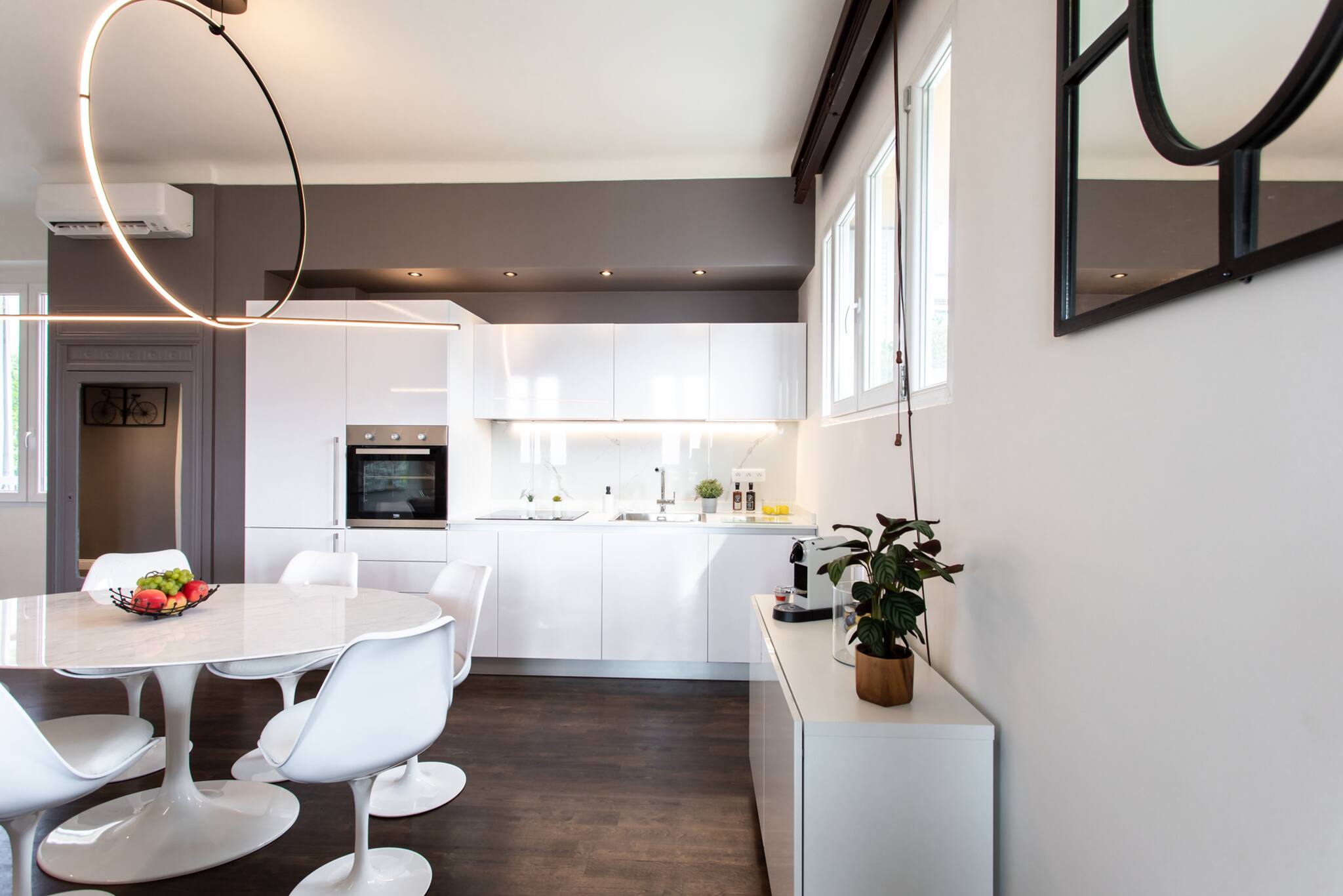 . Une cuisine équipée : lave-vaisselle, réfrigérateur avec espace congélateur, micro-onde, four, plaque de cuissons avec hotte, machine à laver, machine à café Nespresso, bouilloire, grille-pain et un kit avec le nécessaire pour cuisiner,