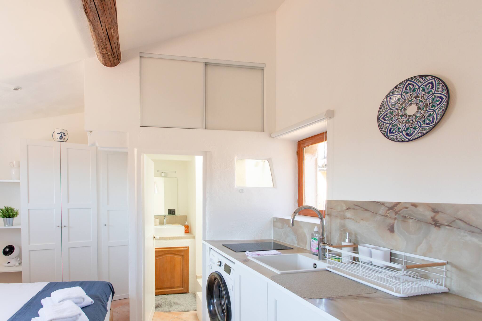 . La cuisine est équipée de feux à induction, Mini frigo avec compartiment congélateur, four micro-onde, cafetière Nespresso, bouilloire électrique, grille-pain, évier, plan de travail un kit pour cuisiner, vaisselle, couverts et espaces de rangements