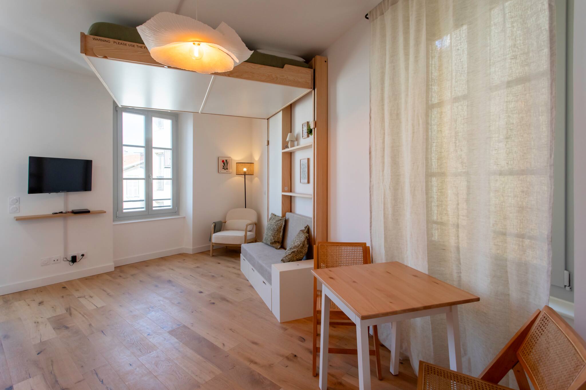 Ce lumineux logement de 20m² est perché sur les toits du Vieux Nice. Situé au 5ème étage sans ascenseur le calme et l' aperçue Mer au dessus des toits seront votre récompense. Sa localisation à 5 mins de marche de la Mer et 3 mins du marché au fleurs est idéale Tramway T1 et parkings publiques à 5mins. Équipe avec soins: clim réversible, WIFI, lit double 140cm, espace repas, cuisine équipée, micro-onde, machine à laver, salle de douche avec WC. Idéal pour profiter du cœur de Nice à 2 personnes