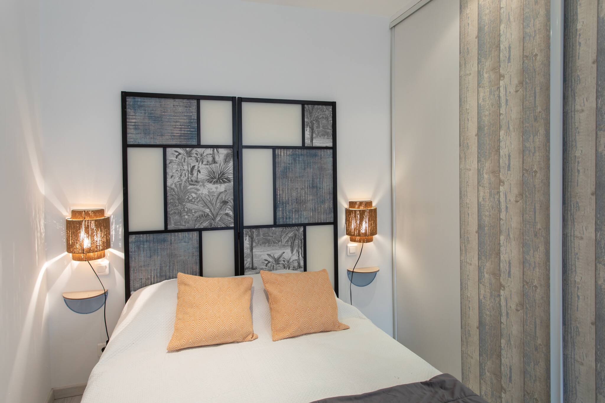 . Un espace chambre avec lit double 140, table de chevets, lampes de chevets, placards de rangements, rideaux occultant donnant sur le reste du logement