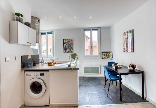 Ce lumineux logement de 20m² est perché sur les toits du Vieux Nice. Situé au 5ème étage sans ascenseur le calme et l' aperçue Mer au dessus des toits seront votre récompense. Sa localisation à 5 mins de marche de la Mer et 3 mins du marché au fleurs est idéale Tramway T1 et parkings publiques à 5mins. Équipe avec soins: clim réversible, WIFI, lit double 140cm, espace repas, cuisine équipée, micro-onde, machine à laver, salle de douche avec WC. Idéal pour profiter du cœur de Nice à 2 personnes