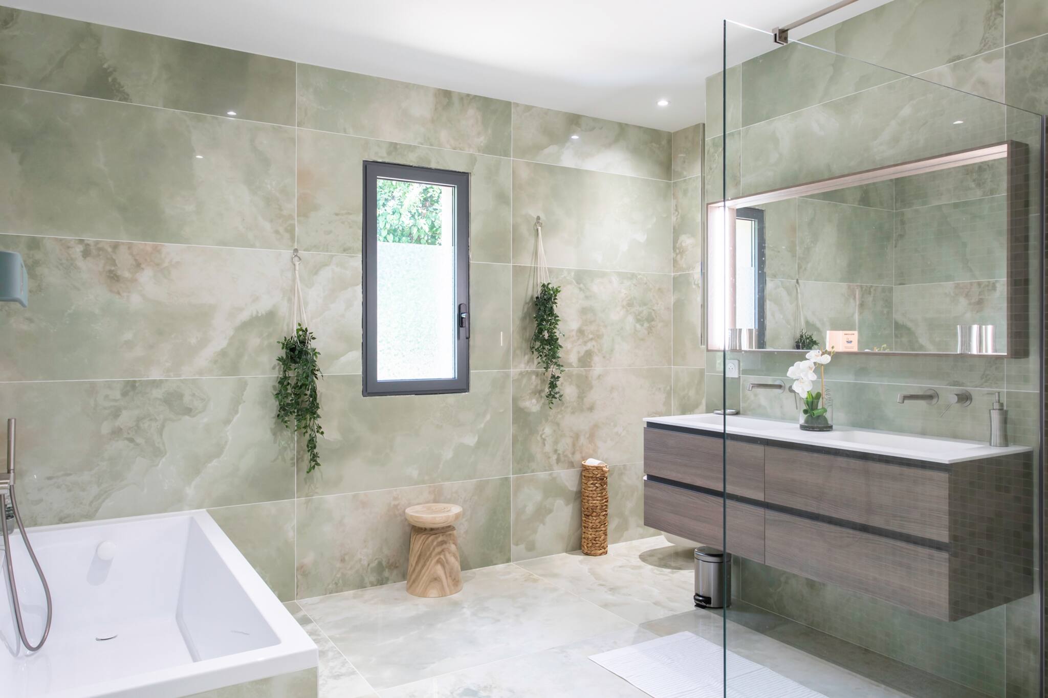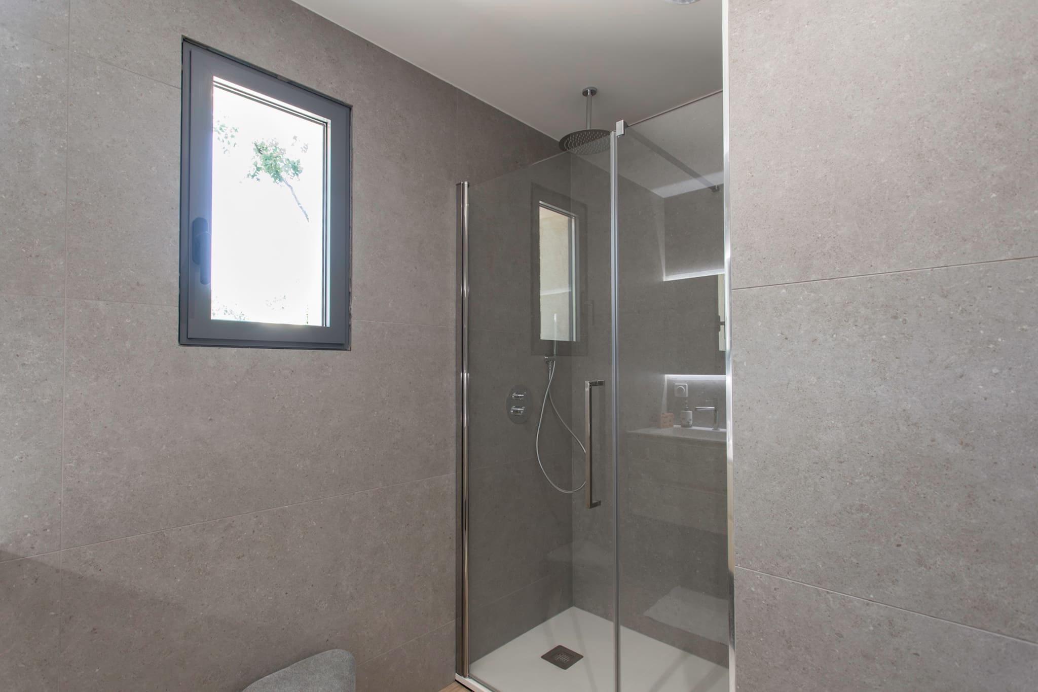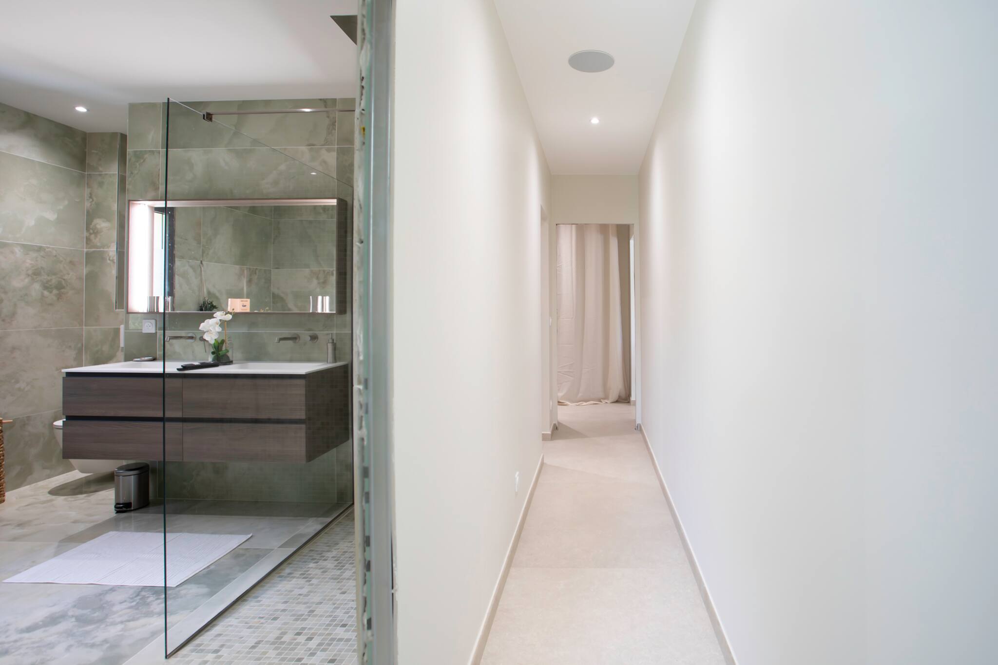 . Une salle de bain commune aux deux chambres avec douche à l’italienne, miroir, évier , sèche-cheveux et sèche serviette