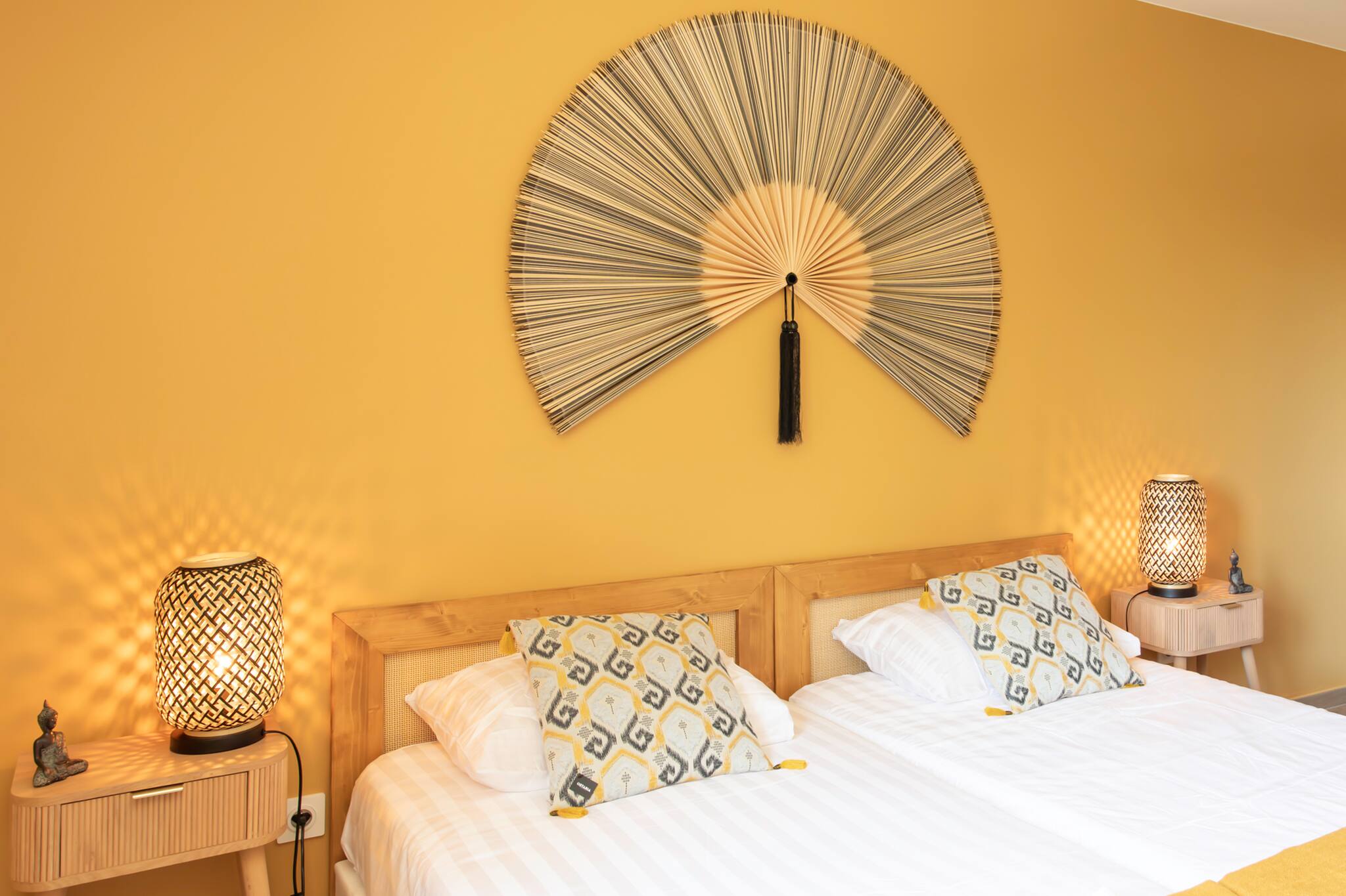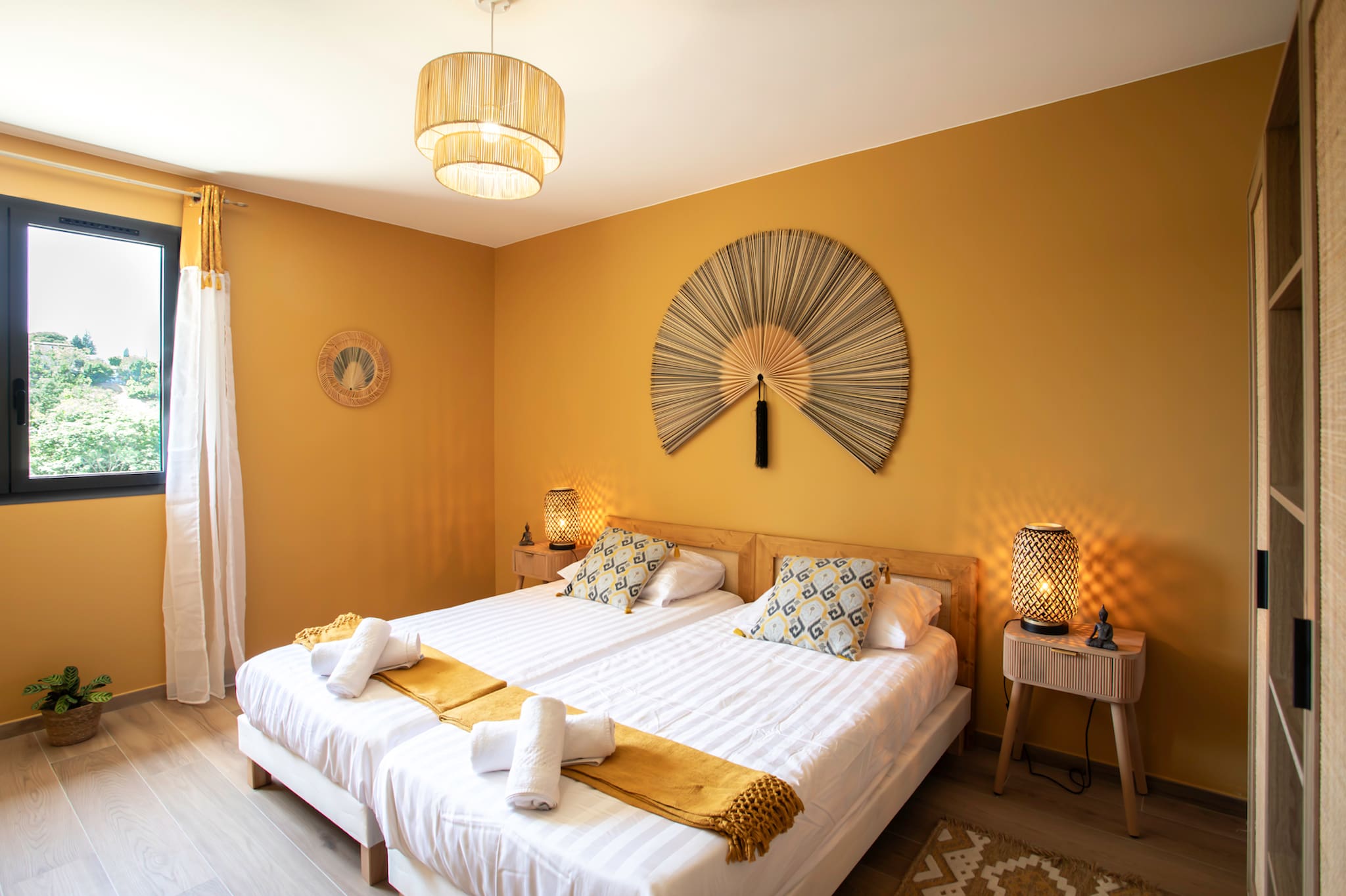 . Une première chambre (la chambre jaune) équipée avec deux lits jumeaux 90cm, climatisation réversible, placard de rangements, tables de chevets et lampes de chevets, fenêtre double vitrage donnant sur le jardin & la piscine