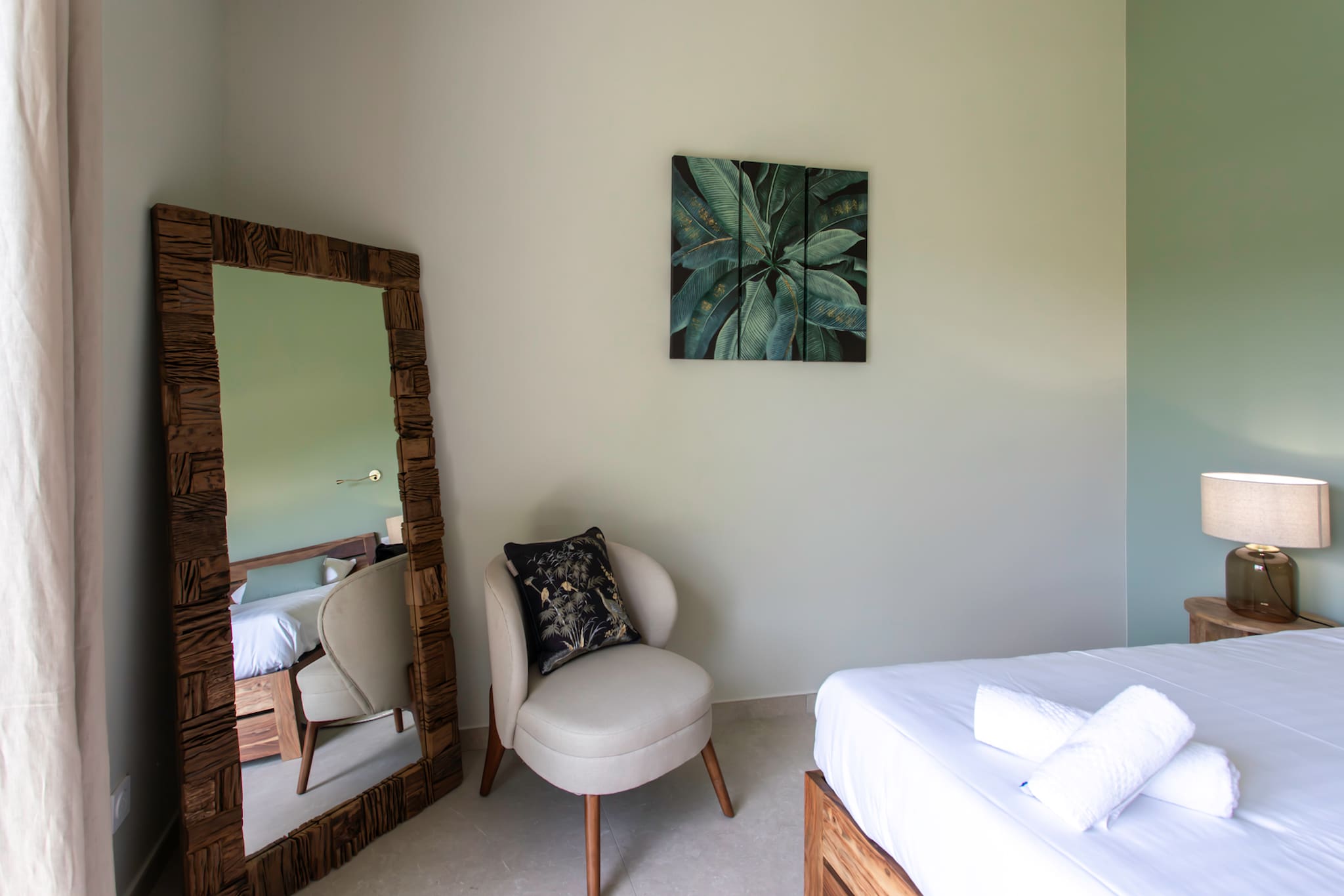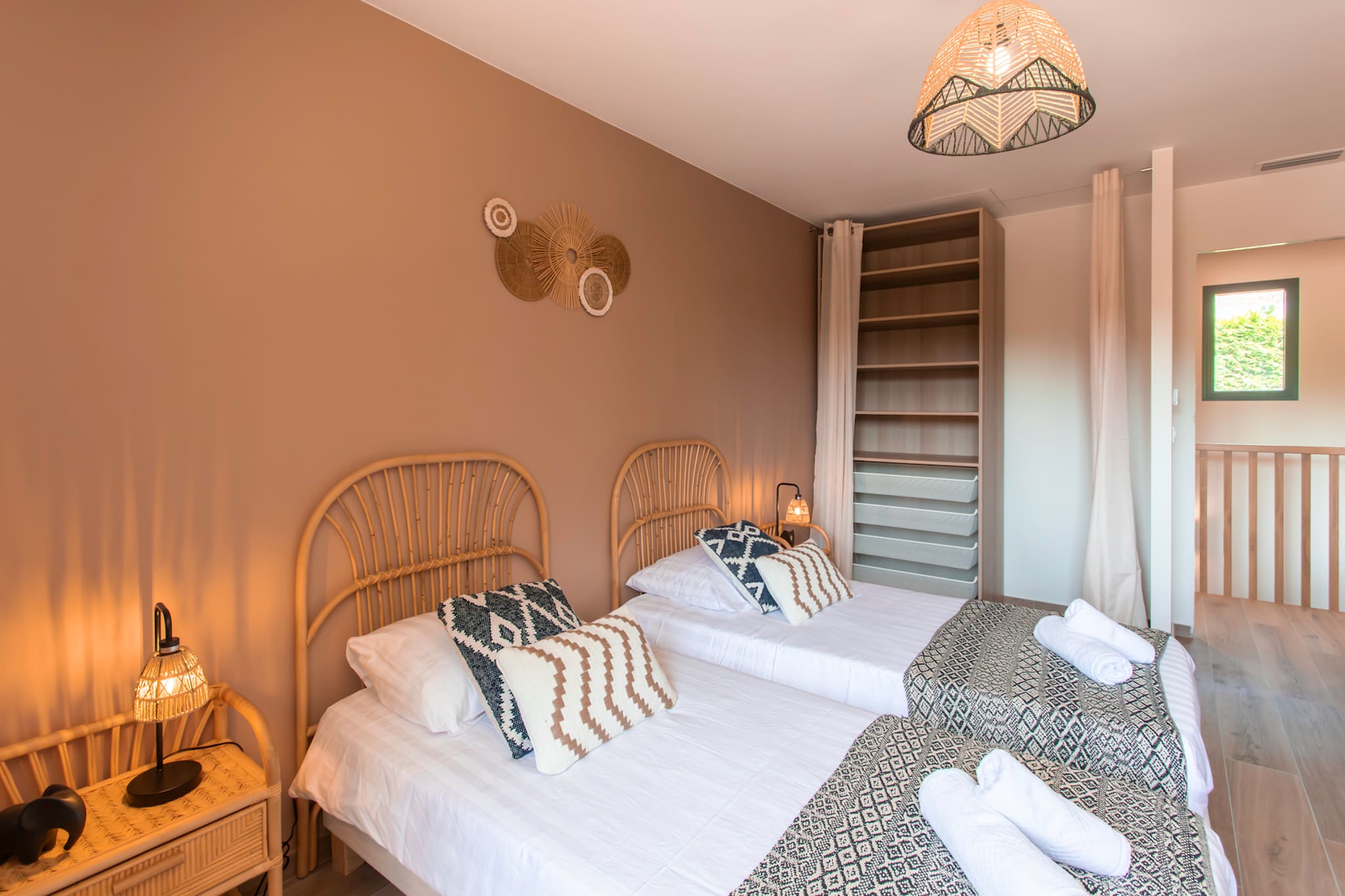 . Une deuxième chambre (la chambre beige) équipée avec deux lits jumeaux 90cm, climatisation réversible, dressing, tables de chevets et lampes de chevets, fenêtre double vitrage donnant sur le jardin & la piscine