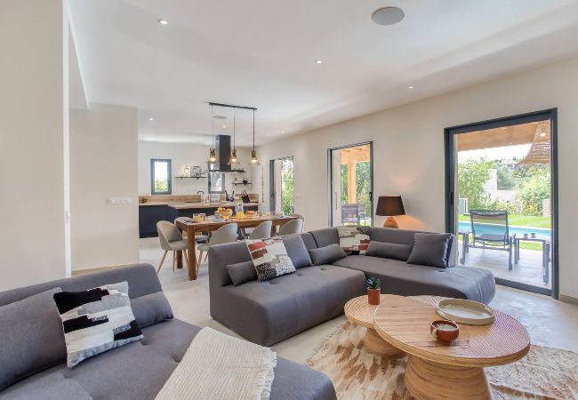. D’un magnifique espace salon cuisine ouverte avec vue Jardin et piscine