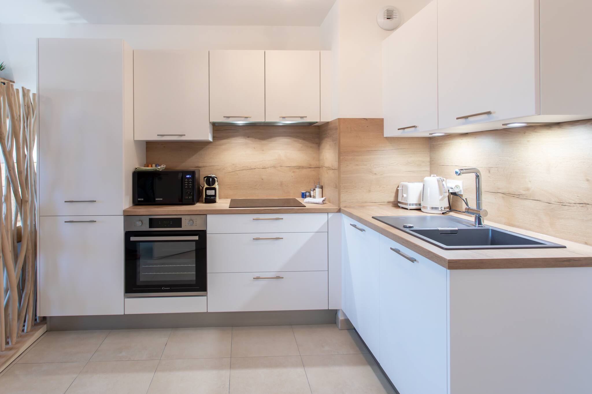 Кухня, оборудовано холодильник, микроволновая печь, духовка, морозильная камера, посудомоечная машина, столовые приборы, кухонная утварь, кофеварка, тостер и Чайник.
