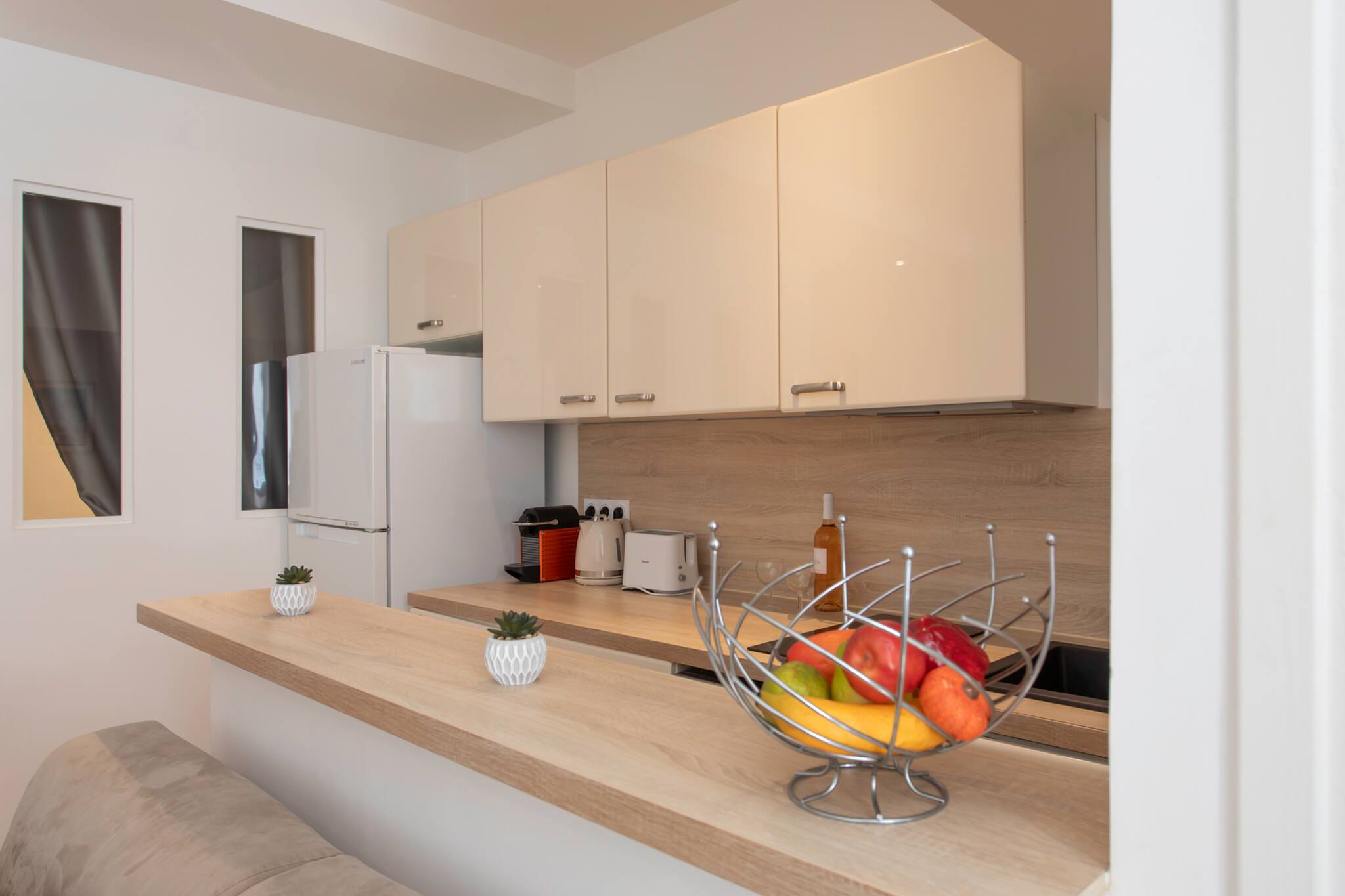 Кухня, оборудовано холодильник, микроволновая печь, морозильная камера, столовые приборы, кухонная утварь, кофеварка, тостер и Чайник.