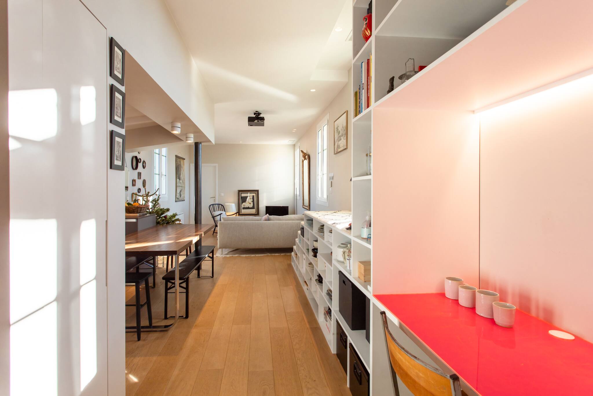 Кухня, совмещенная с залом, оборудовано холодильник, микроволновая печь, духовка, морозильная камера, посудомоечная машина, столовые приборы, кухонная утварь, кофеварка, тостер, Чайник и Плита.