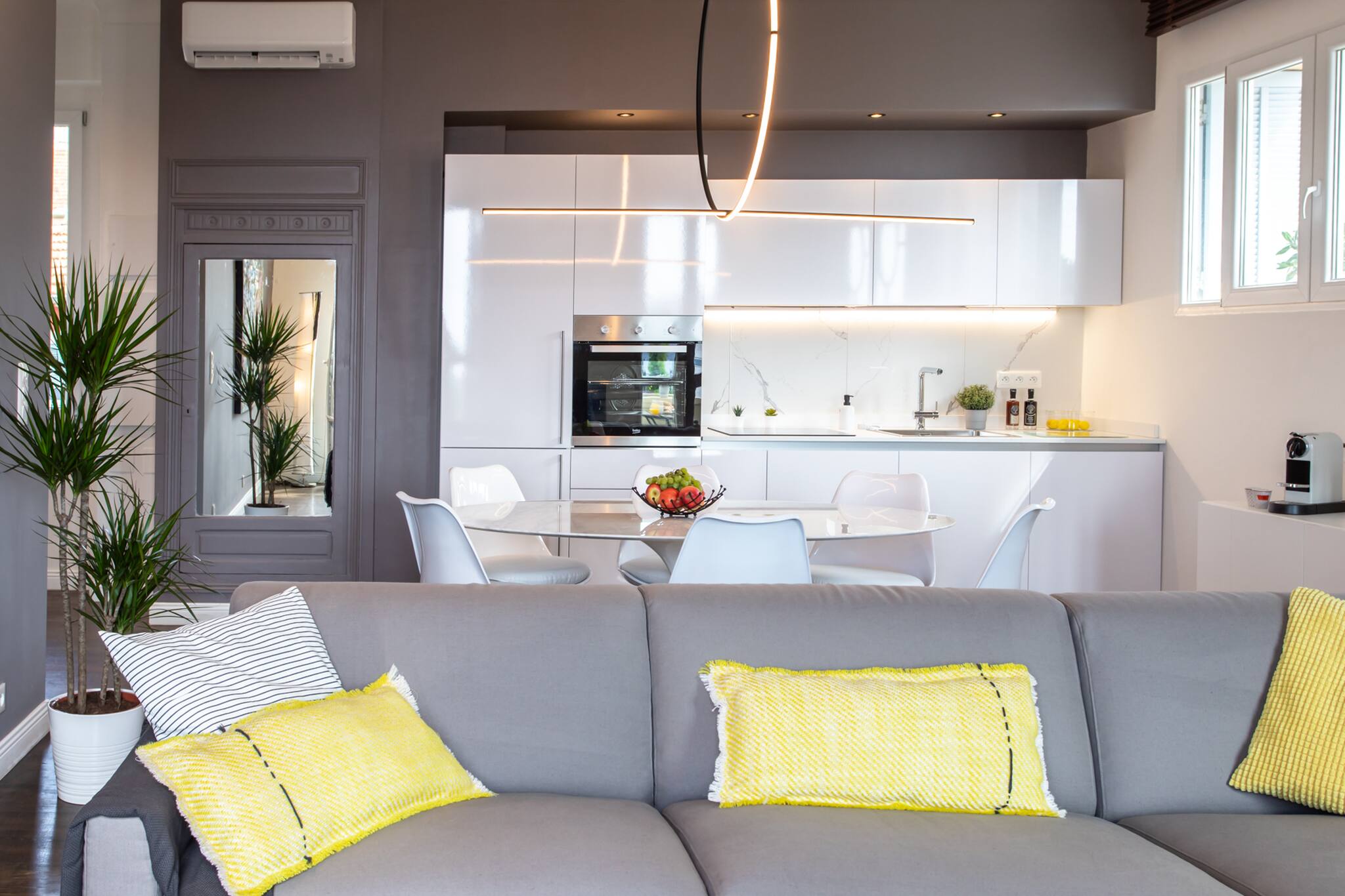 Кухня, совмещенная с залом, оборудовано холодильник, микроволновая печь, духовка, морозильная камера, посудомоечная машина, столовые приборы, кухонная утварь, кофеварка, тостер и Чайник.
