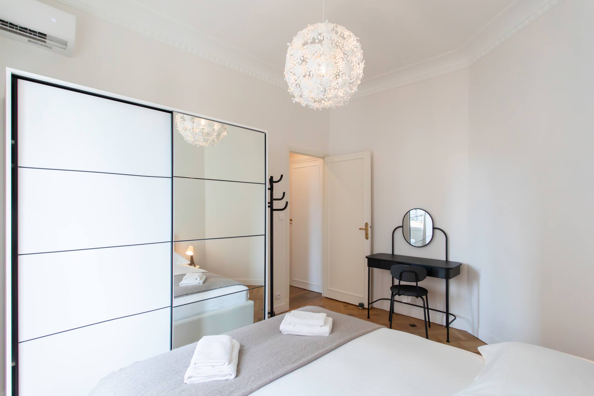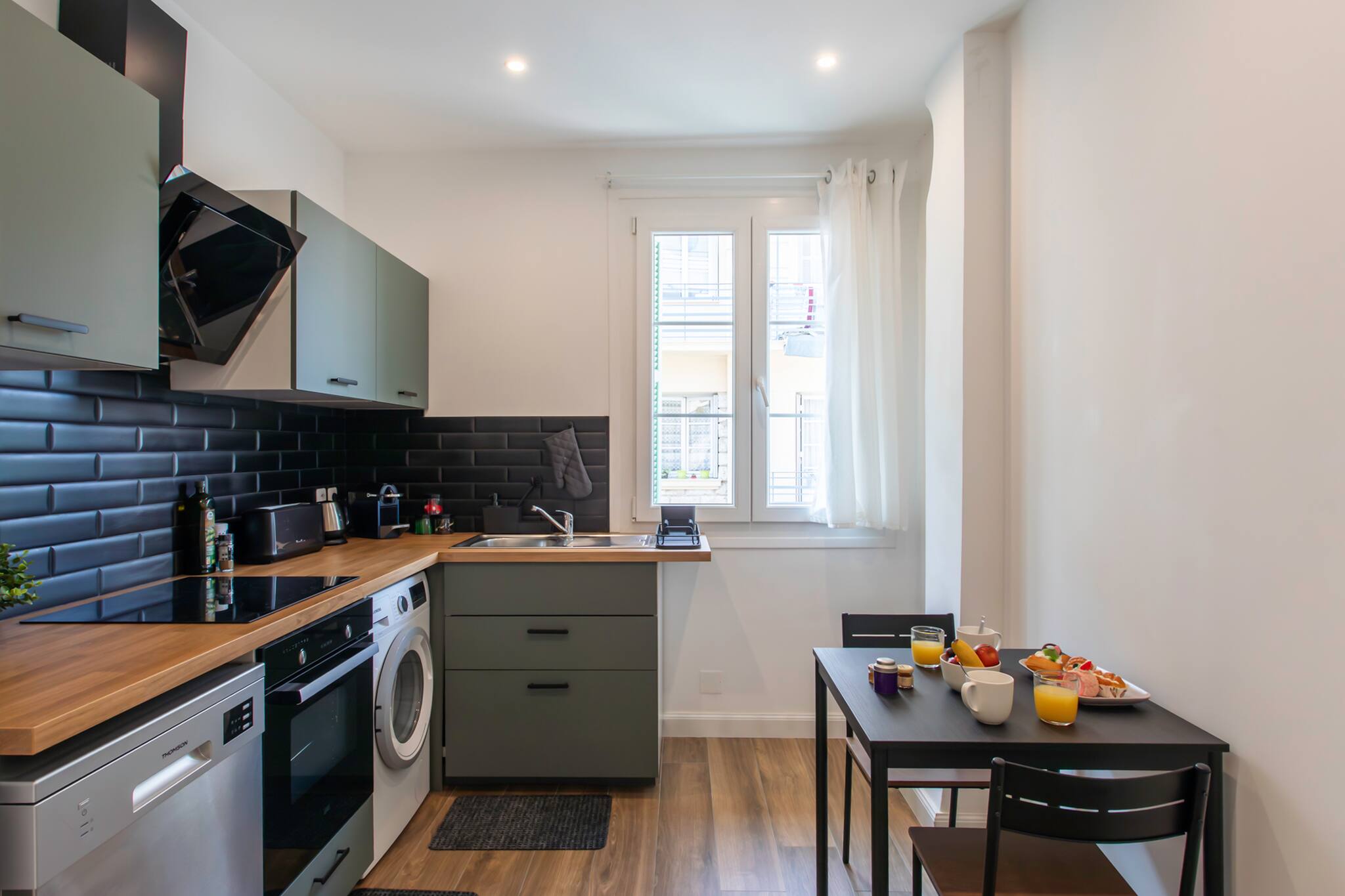 在 Nice 的 公寓 有 1 卧室 有 可容纳 2 人. 住宿 有 40 m². 坐落于一个 安静的 的区域 或 在市中心. 配有 电梯, 洗衣机, 熨斗, 吹风机, 阳台, 中央暖气, 空调, 1 电视. 该 独立式厨房, 配备有 冰箱, 微波炉, 烤箱, 冰柜, 洗碗机, 碗碟/刀具, 餐具/厨房, 咖啡壶, 面包机 和 烧水壶.